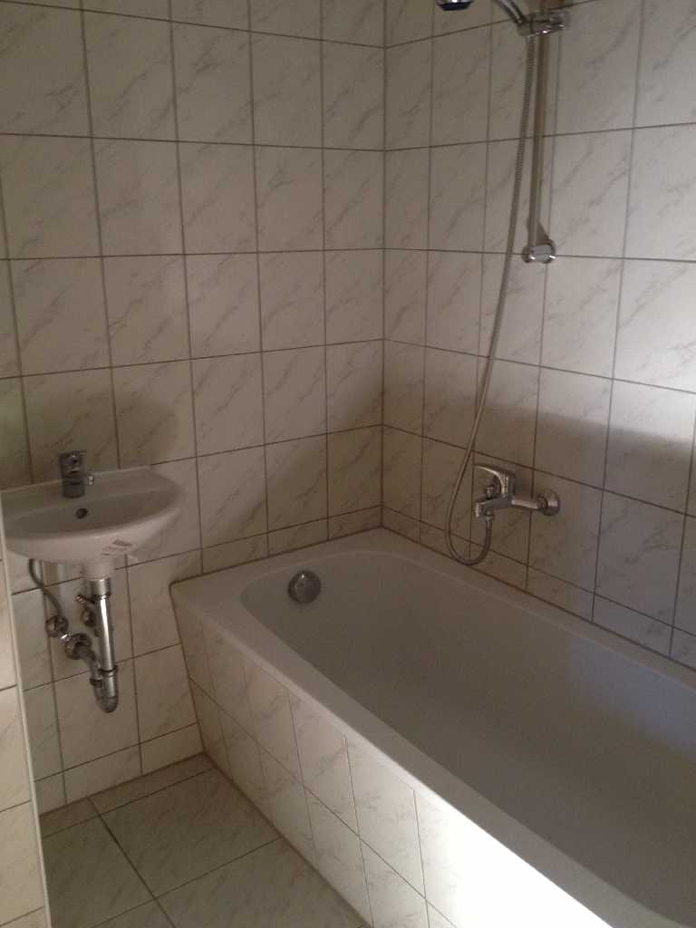 Raufaser weiß, Laminatfußboden, Diele gefliest, innliegendes WC und separates Bad mit Wanne gefliest, Balkon
